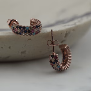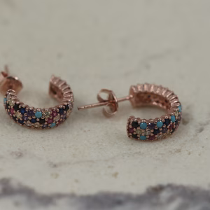 Ove rose gold minđuše sa kombinovanim cirkonima u boji donose prelep spoj luksuza i boje. Cirkoni u različitim nijansama stvaraju dinamičan vizualni efekat, dodajući živahnost i sofisticiranost vašem izgledu. Izrađene od rose gold materijala, minđuše su savršen izbor za ljubitelje modernog i elegantnog nakita, idealne za posebne prilike ili kao luksuzni detalj svakodnevnih kombinacija.