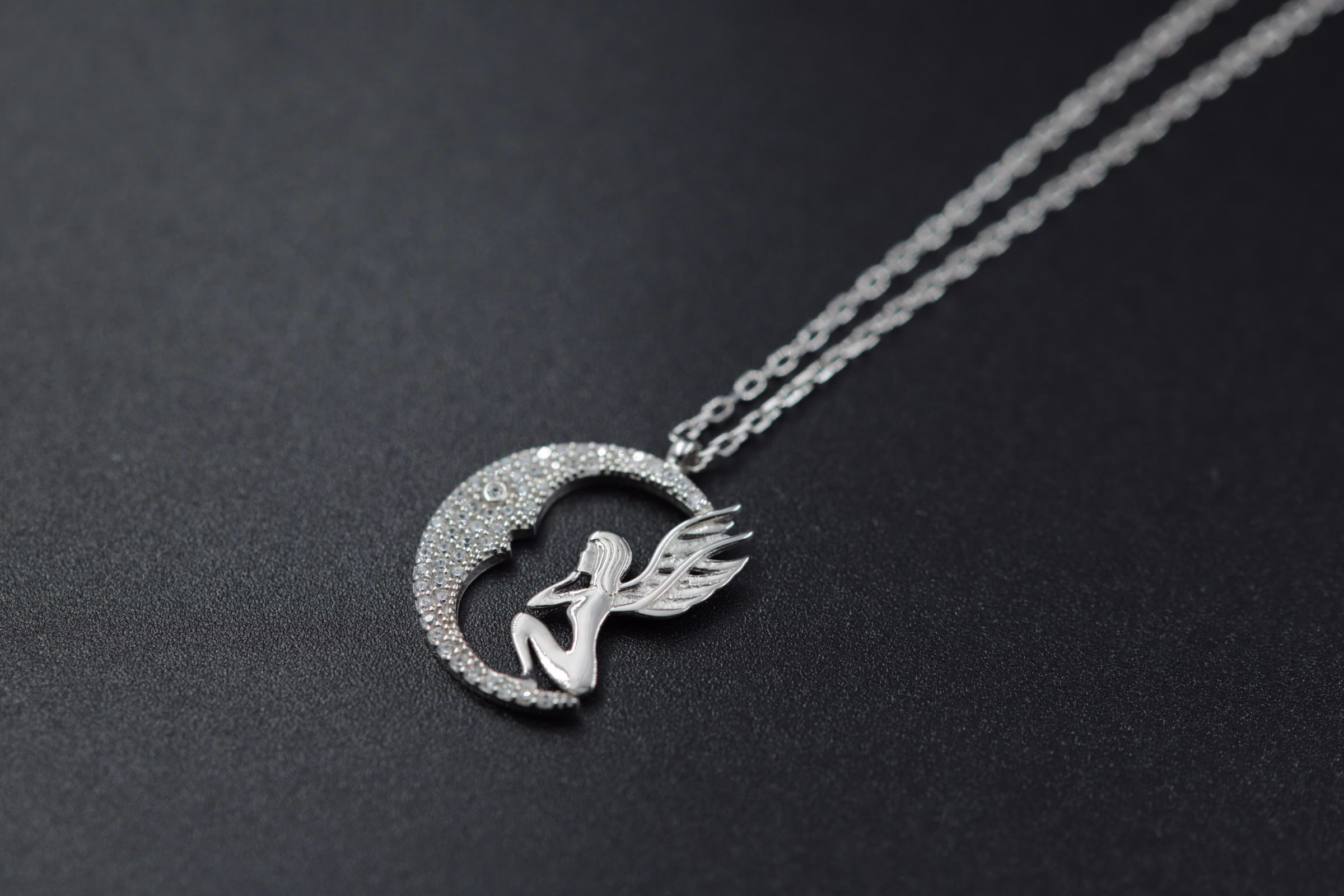 Prelepa srebrna ogrlica sa detaljno izrađenim privjeskom u obliku polumjeseca ukrašenog sitnim kristalima, na kojem sedi vila sa nežno oblikovanim krilima. Ovaj bajkoviti motiv unosi dozu magije i romantike u svaki stil, čineći je idealnim izborom za ljubitelje unikatnog nakita.