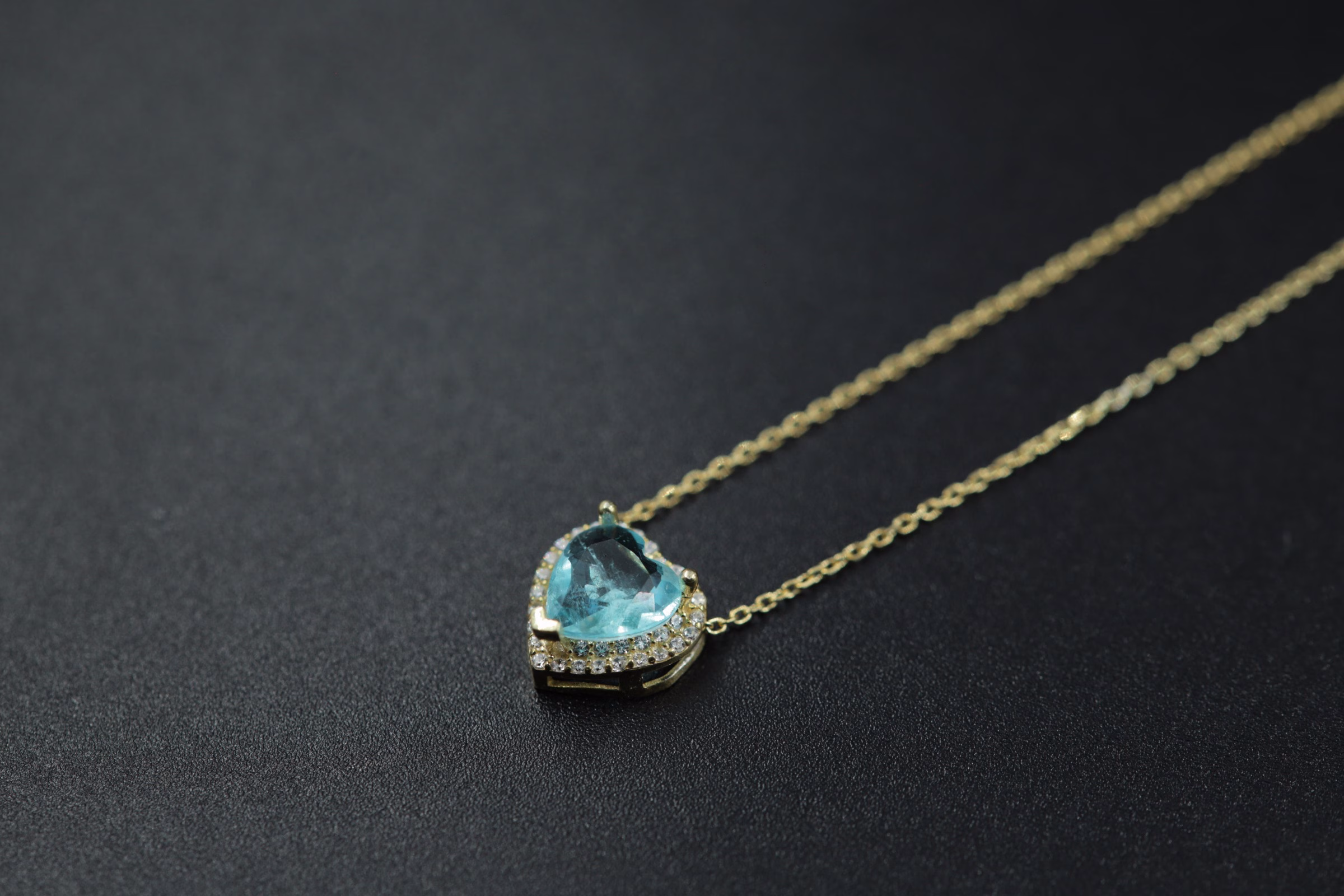 Elegantna srebrna ogrlica sa prelepim priveskom u obliku srca, ukrašena svetloplavim kamenom koji podseća na boju mora. Oko centralnog kamena nalazi se niz sitnih cirkona koji dodaju poseban sjaj i luksuzan izgled. Savršena je za sve prilike, od svakodnevnog nošenja do svečanih događaja.