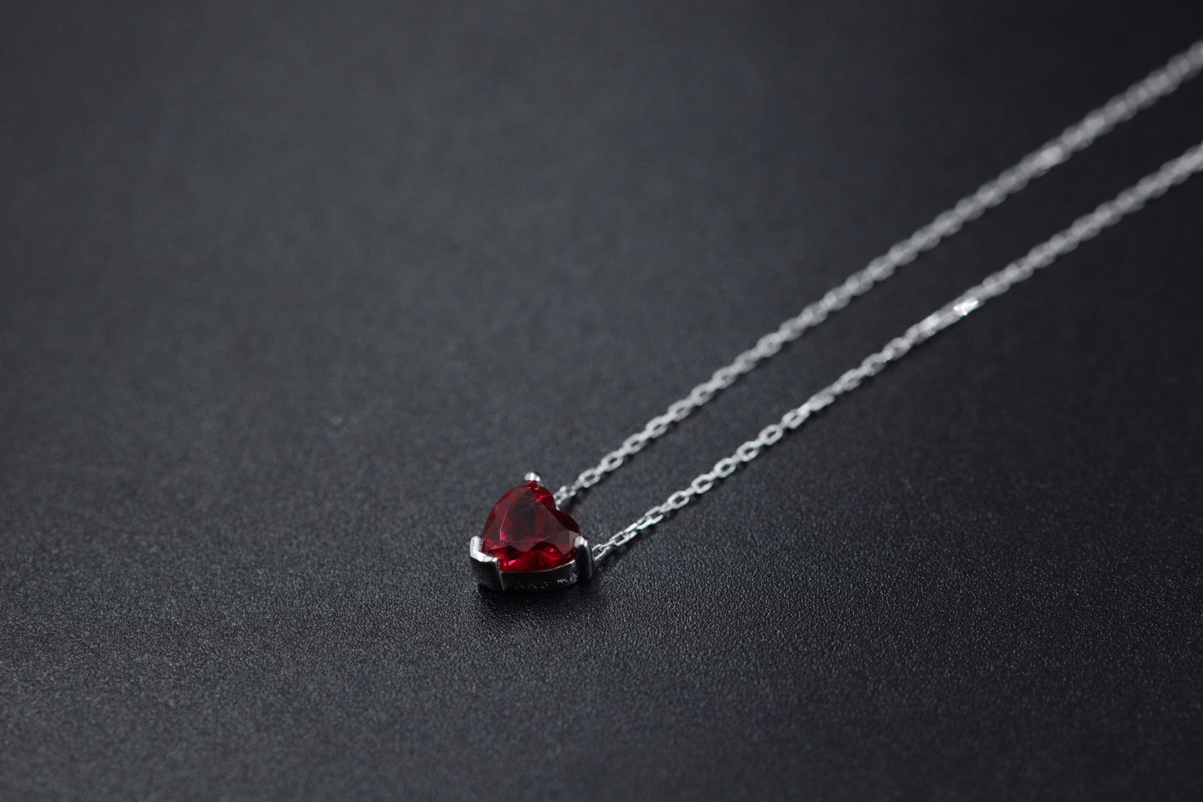 Srebrna ogrlica sa crvenim cirkonom u obliku srca.