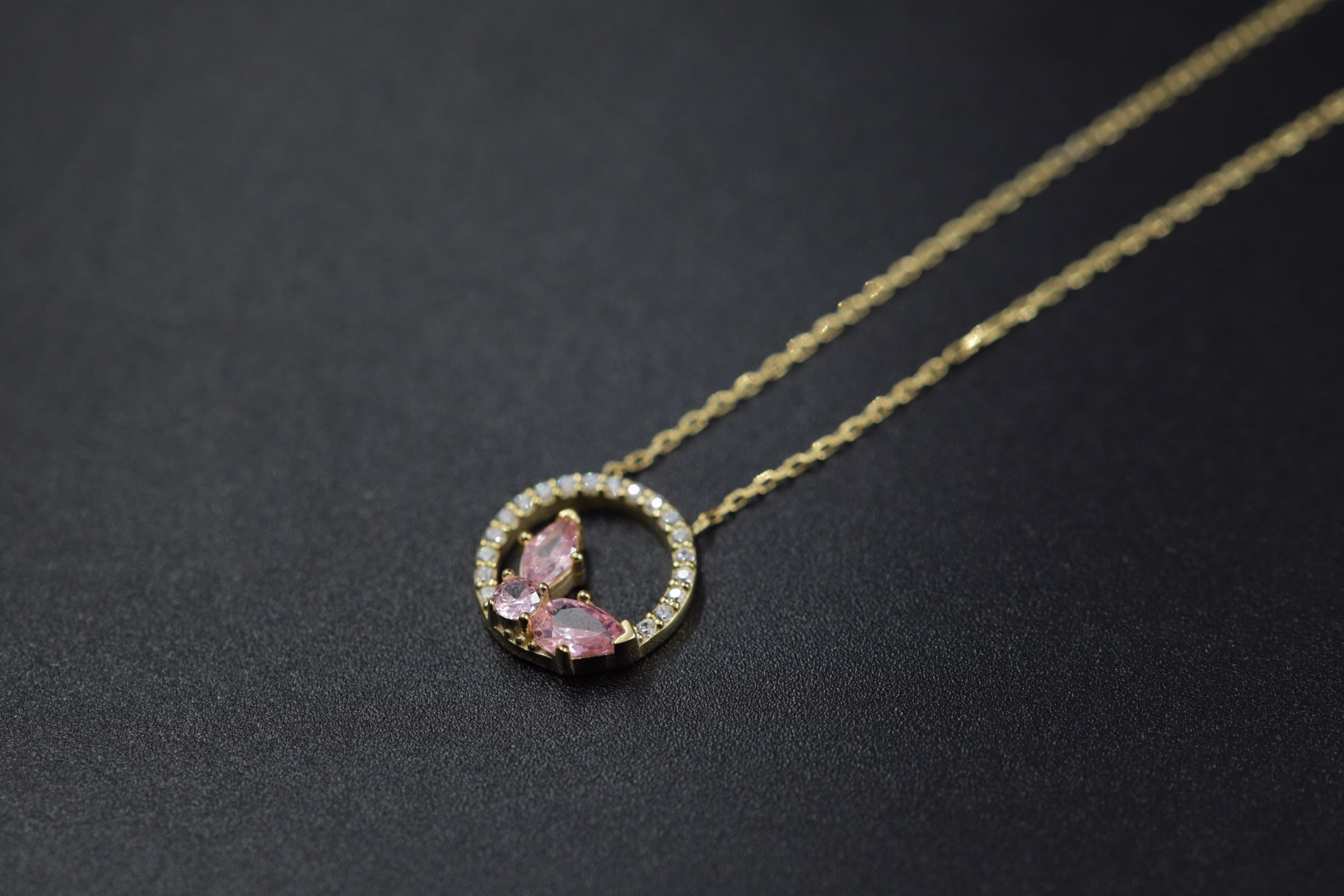 Ogrlica sa kružnim priveskom i leptirićem od roze cirkona.