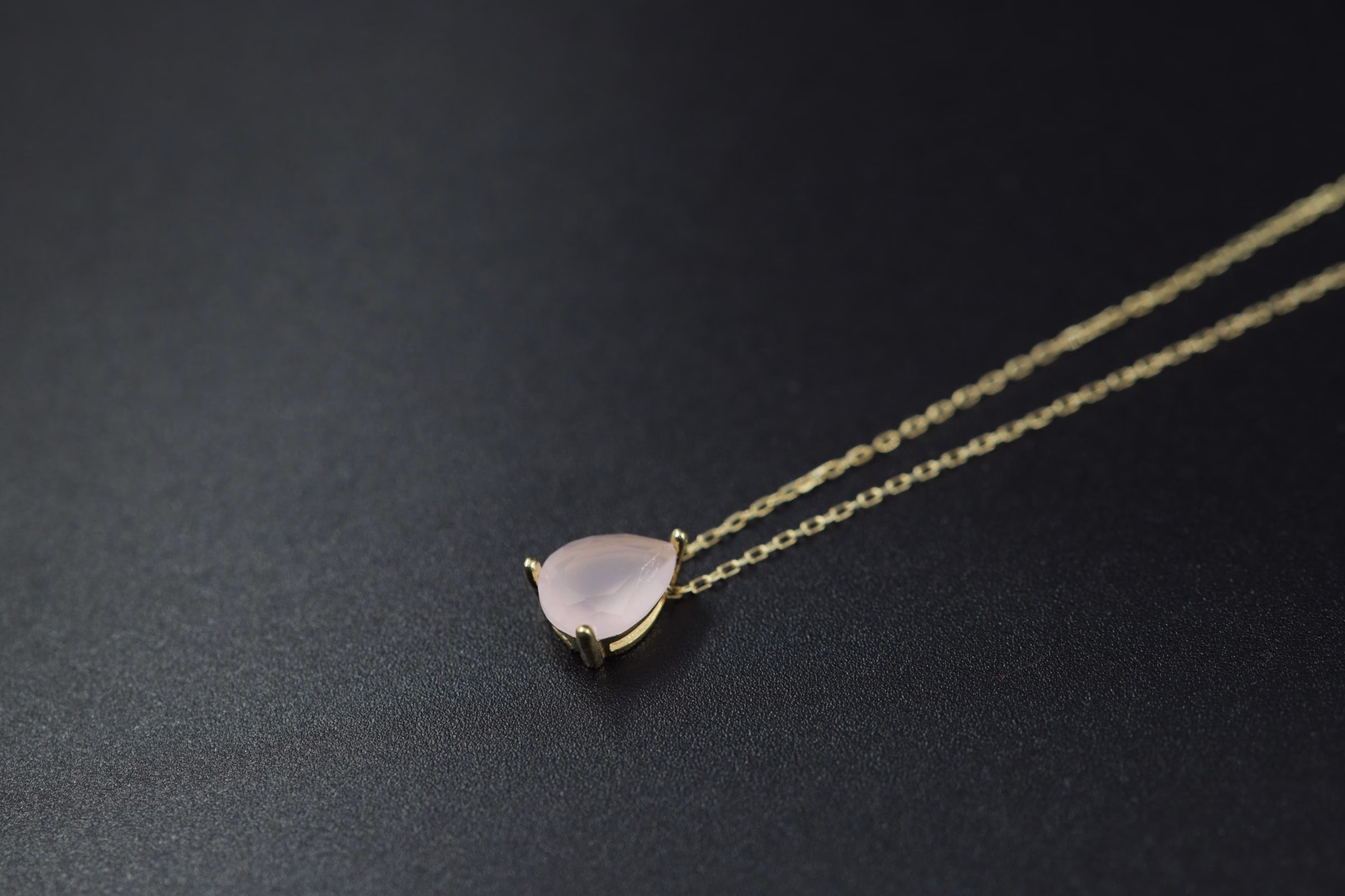 Ova prefinjena ogrlica izrađena je od delikatnog zlatnog lanca sa privjeskom u obliku suze, ukrašenim prirodnim roze kvarcom. Njegova nežna ružičasta nijansa simbolizuje ljubav i harmoniju, dok elegantan oblik i jednostavan dizajn čine ovaj komad idealnim za svakodnevno nošenje ili posebne prilike. Savršen je izbor za poklon dragoj osobi ili kao suptilan, romantičan dodatak vašoj kolekciji nakita.