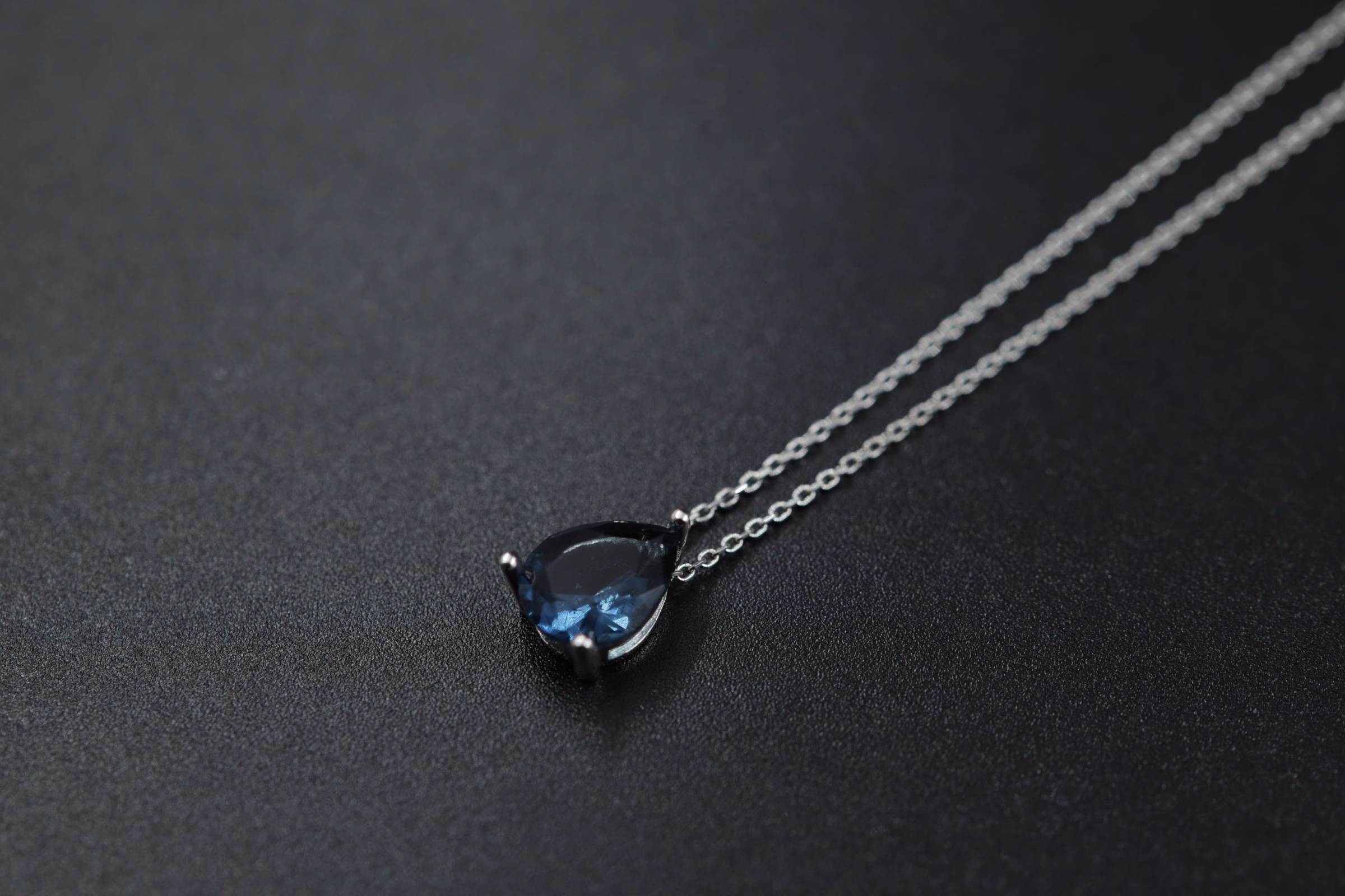 Srebrna ogrlica sa priveskom u obliku suze i plavim kristalom.