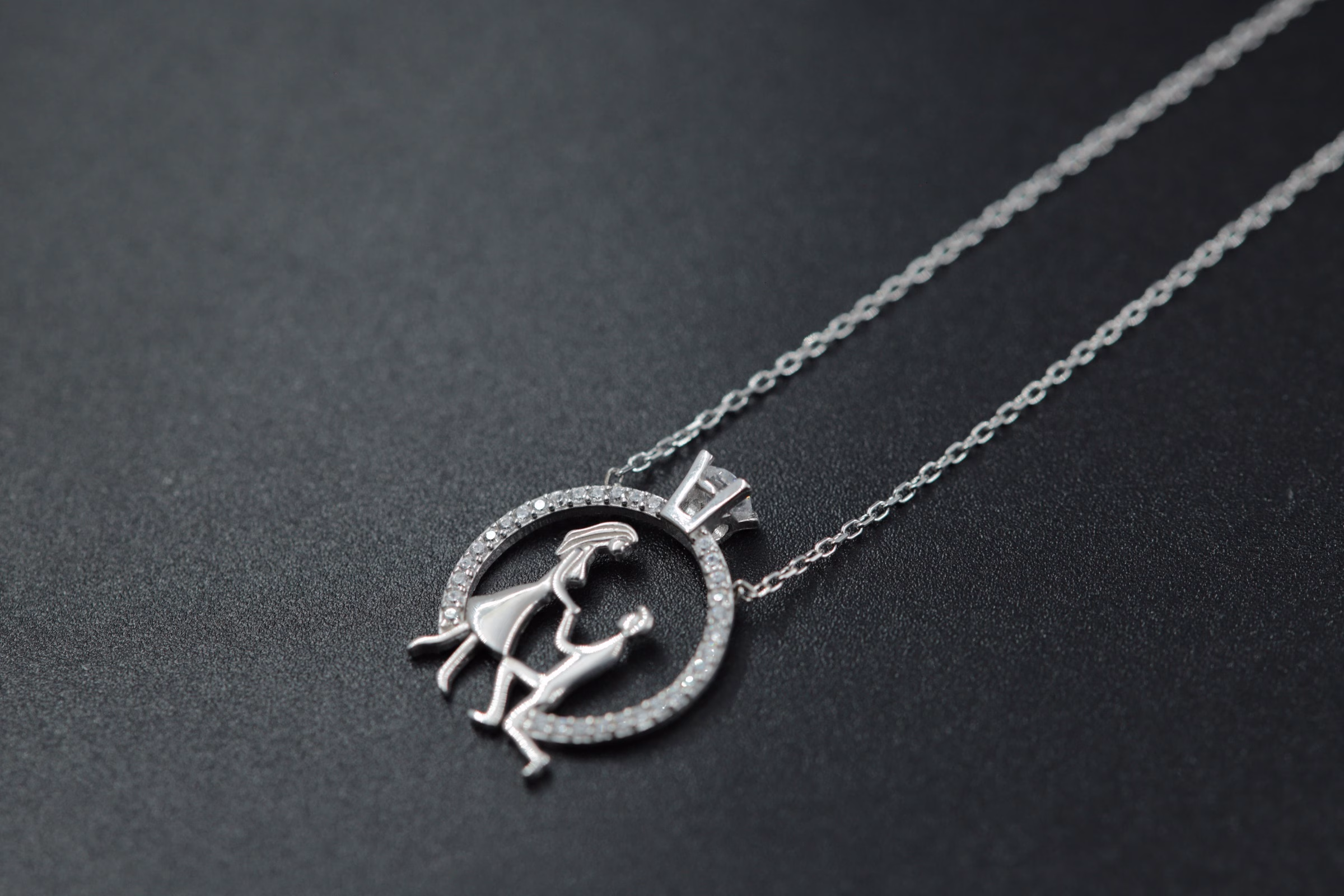 Srebrna ogrlica sa priveskom majke i deteta unutar kruga ukrašenog cirkonima.