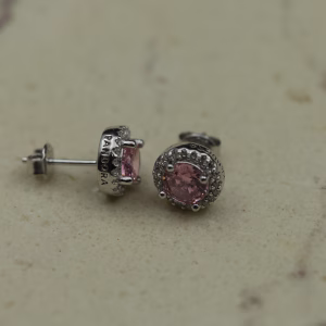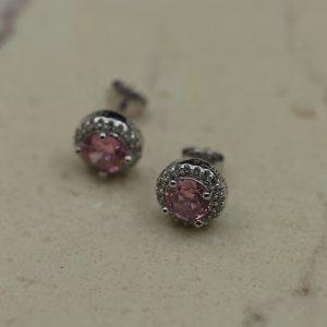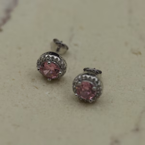 Minđuše izrađene od srebra 925 sa okruglim roze kamenom u centru, nežno uokvirenim nizom sitnih prozirnih cirkona. Kombinacija toplog pastelno roze tona i sjajnog srebra daje eleganciju i svežinu u isto vreme. Dizajn je diskretan, ali izražajan — pogodan za svakodnevnu eleganciju, ali i za posebne prilike koje zahtevaju suptilan sjaj.