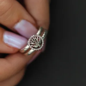Ovaj dupli srebrni prsten kombinuje upečatljiv dizajn sa dubokom simbolikom Drveta života – simbola koji predstavlja snagu, stabilnost, lični razvoj i povezanost sa svetom oko nas. Centralni motiv elegantno je uklopljen između dva spojena dela, stvarajući vizuelno atraktivan i stabilan komad nakita. Prsten je izrađen od srebra 925 finoće, sa pažljivo obrađenim detaljima koji naglašavaju njegovu duhovnu i estetsku vrednost. Idealan je za svakodnevno nošenje, kao i za poklon sa dubokim značenjem.