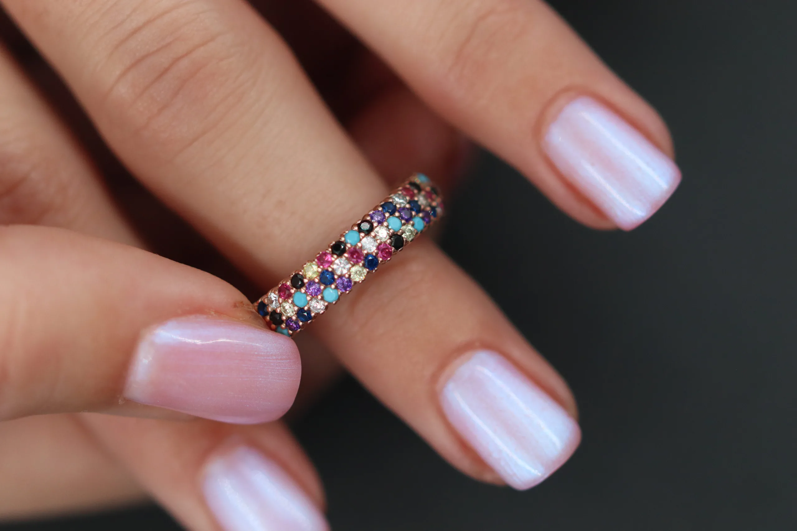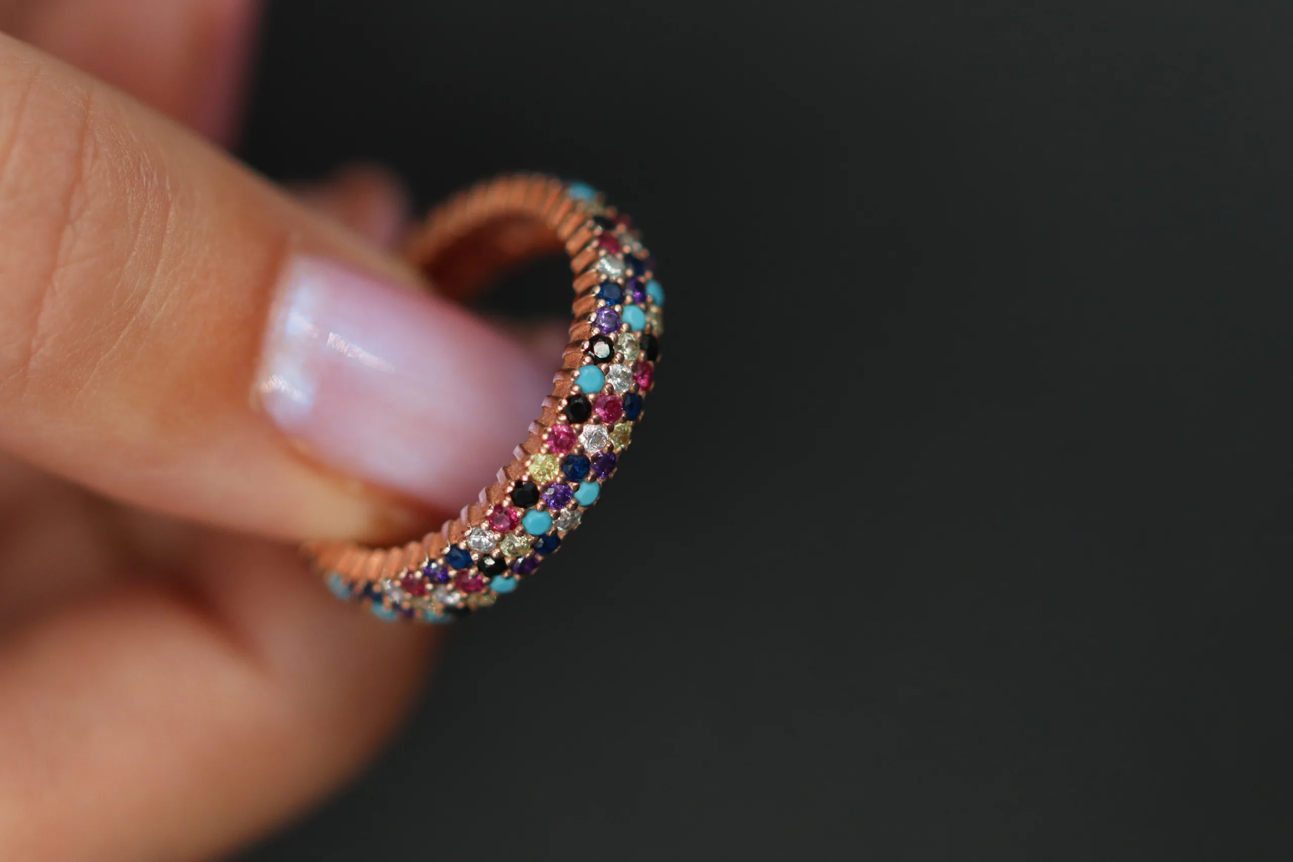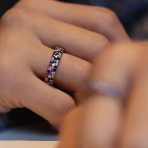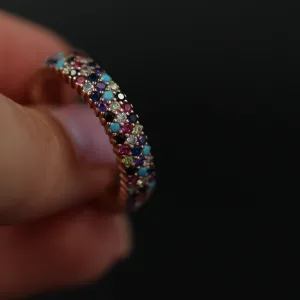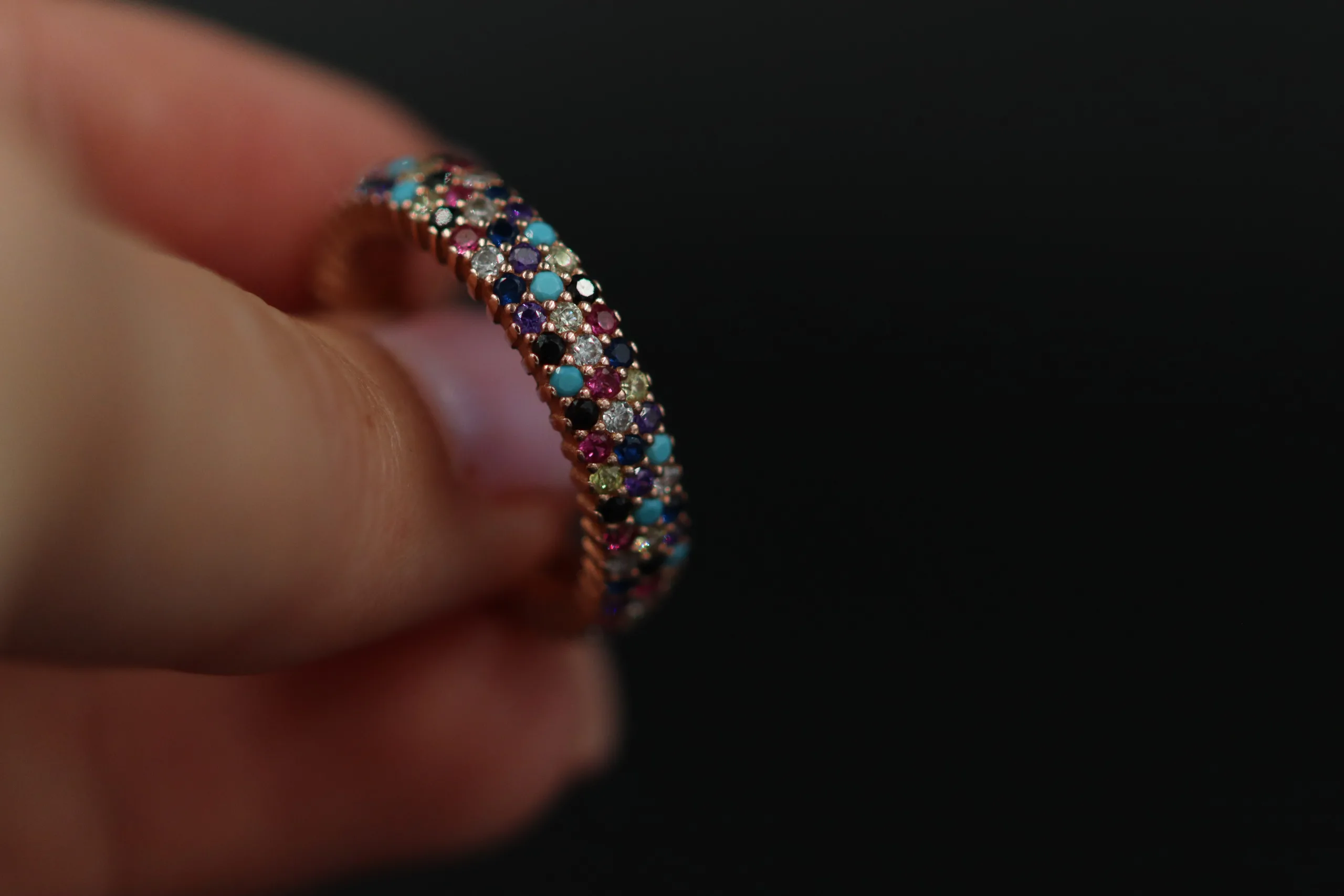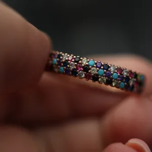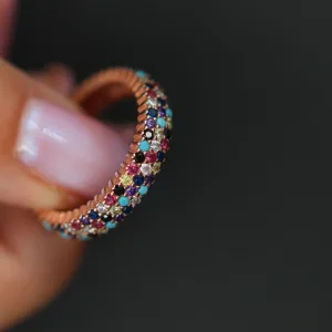 Ovaj prefinjeni srebrni prsten donosi raskoš boja i jedinstven dizajn koji osvaja na prvi pogled. Ukrašen precizno postavljenim cirkonima u raznim nijansama – od tirkizne, crne i zlatne do nijansi roze i plave – ovaj prsten je savršen izbor za one koji vole da se istaknu. Njegova baza od srebra 925 finoće garantuje dugotrajnost i udobnost, dok fino polirani završni sloj dodaje dodatnu dozu luksuza. Idealan je kao poklon za posebne prilike ili kao sofisticirani dodatak vašoj kolekciji nakita.